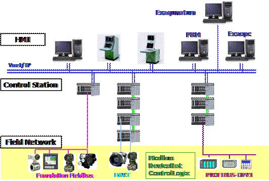 横河CentumVP综合生产控制系统是实现生产控制最优化的平台,生产控制最优化主要关注生产的灵活性和适应性。集散控制系统(DCS)是流程工业关键的控制设备,形象地称其为过程工业的“大脑”和“眼睛”。它的可用性﹑可靠性和安全性以及灵活的扩展和新技术的集成能力决定着整个工厂生产运行中控制系统对生产效益贡献的大小以及能够降低设备生命周期内的维护成本。为此用户往往在选择DCS系统时会很慎重。横河电机是DCS的著名供应商,其DCS产品在业界具有“系统不死机”和“产品可靠性高、备品配件少”的特点。其主要系统结构如下: